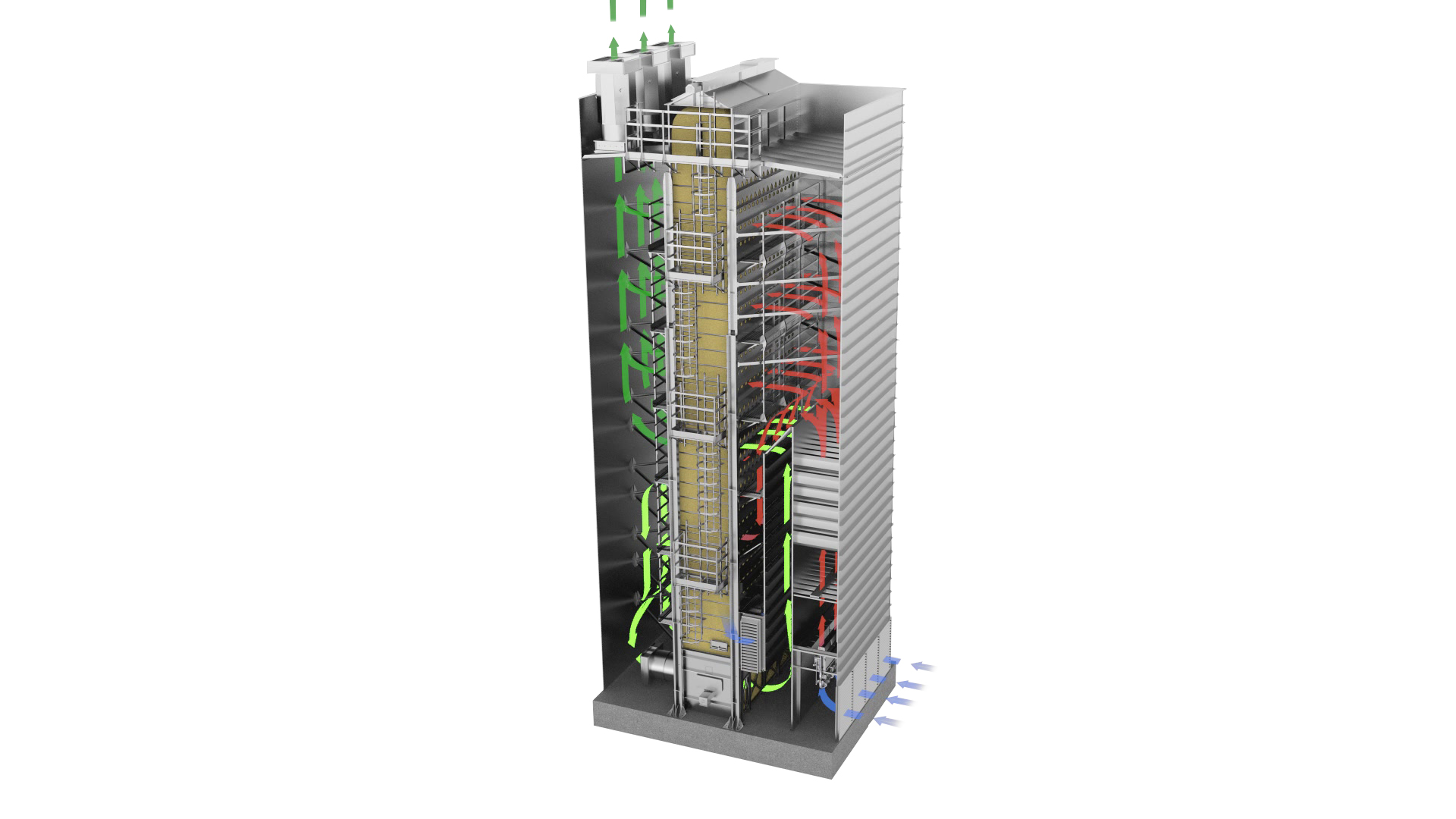 Зерносушилки поточного типа серии FR на сегодняшний день являются самыми современными и экономичными в мире. Об этом свидетельствует как качество изготовления зерносушилки, так и уникальная технология сушки. Шахта зерносушилки Strahl выполнена из гальванизированной стали высокого качества, а все внутренние панели изготовлены из стали Aluzink. Это уникальная сталь с покрытием из алюминия и цинка, которая в 3 раза дольше сопротивляется коррозии и обесцвечиванию, чем обычная оцинковка. За счет уникального покрытия металл способен к саморегенерации, заживляя царапины и повреждения. Это увеличивает срок эксплуатации зерносушилки в разы. Вся шахта зерносушилки полностью теплоизолирована. Бесшумные центробежные вентиляторы эффективно удаляют отработанный влажный воздух. Они оборудованы системой пылеподавления и антидождевыми жалюзи. Пульт управления сушилкой оснащен сенсорным экраном с программным обеспечением на русском языке. Линейные горелки Tecflam – еще одна гордость зерносушилок Штраль.